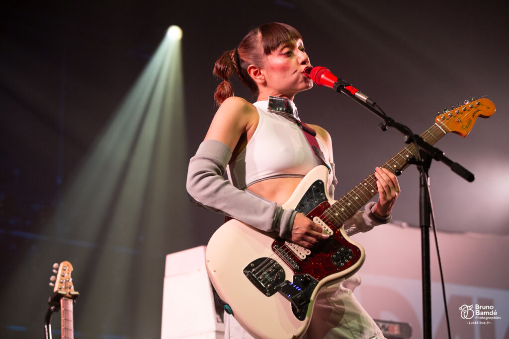 Puis retour Hall 4 pour l’onde de choc Descartes A Kant. Le combo mexicain, originaire de Guadalajara, c’est le fameux mur du son entre surf music, punk, metal, pop et shoegaze que nous espérions. Théâtral, aussi chaotique que calibré au millimètre, dans une esthétique rétro-futuriste, la performance scénique et physique est imparable, la charismatique Sandrushka Petrova en est un atout maitre indéniable. Néons fluo et combinaisons spatiales, tout est top, surtout avec leurs mélodies pleines de fougue, de fantaisie et un peu de Sonic Youth, de St. Vincent, parfait pour tenir le cap. Hors de question d’abandonner en si bon chemin.