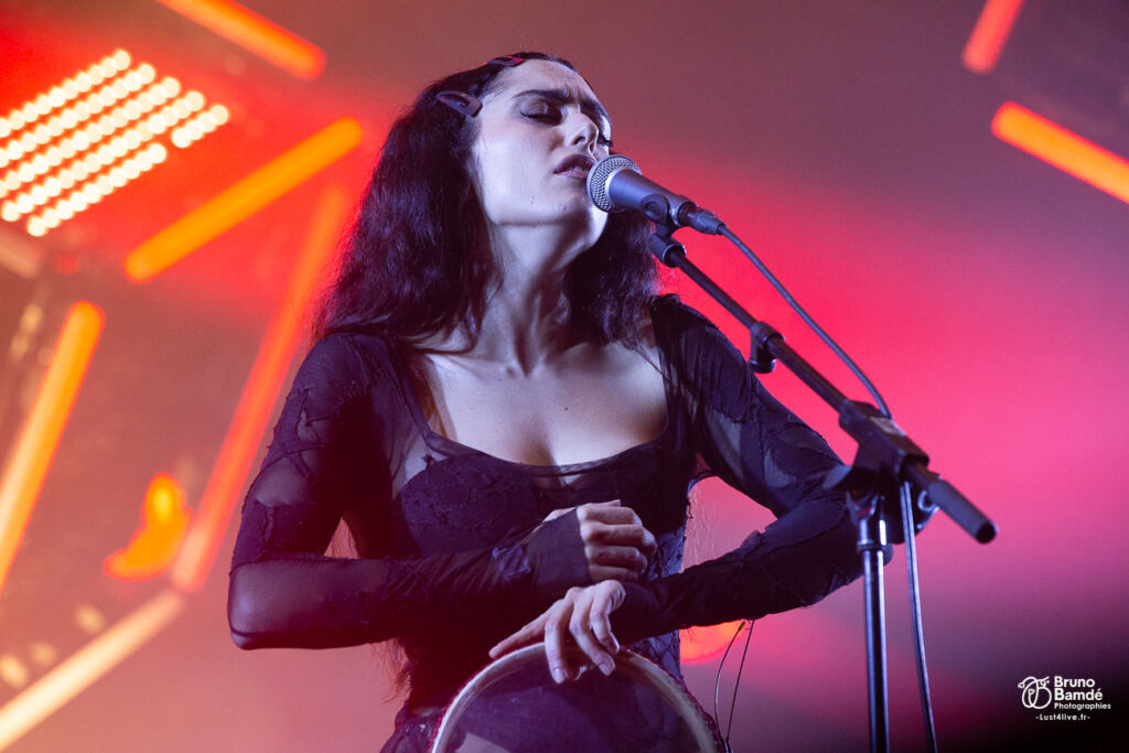 Changement de hall et d’ambiance. C’est un voyage en terre napolitaine que nous propose La Niña. La chanteuse, Carola Moccia, au charme magnétique, apporte avec elle une lumière folk étrange où la puissance d’une tradition est réinventée dans un univers émotionnel plus contemporain. Les nappes sonores du quatuor qui l’accompagne (claviers, batteries et percussions) ajoutent à cette parenthèse ensorcelante un vrai flow enveloppant. On ralentit sans pour autant perdre en intensité, comme si notre parcours nocturne s’ouvrait soudain sur un paysage plus sensible que sensationnel.