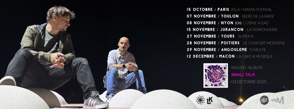 Quatre albums, des centaines de concerts, et toujours cette énergie folle mêlée à cette sensibilité fraternelle désarmante. Après l’émérite « Geranium », le combo Équipe de Foot, formé par Alexandre Cabanac et Michaël Martin, revient avec « Small Talk », un opus à la fois profond, ludique et d’une incroyable liberté. Depuis leurs débuts dans les marges du rock indé, le groupe n’a cessé de muter. Leur son s’est enrichi de textures électro, de ruptures mélodiques, de mélancolie nocturne en hit fiévreux, complexifiant l’alchimie de leur ADN toujours aussi radical. Avec Small Talk, le duo bordelais poursuit son exploration du quotidien, de l’amour, du monde tel qu’il semble être, mélangeant gravité, légèreté, sincérité et autodérision, avec rage et tendresse. Un disque fait par des humains pour des humains, comme ils aiment le dire.