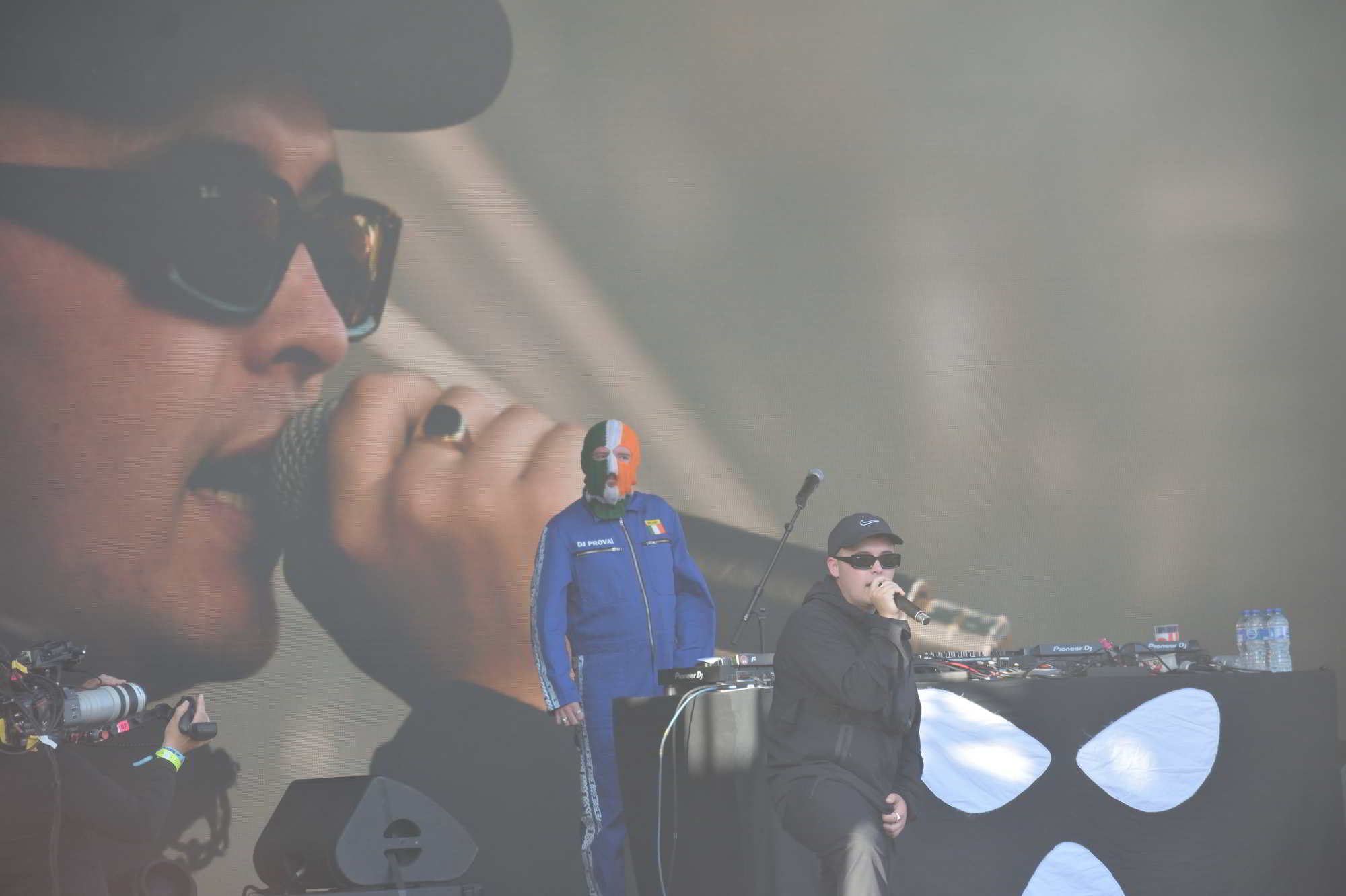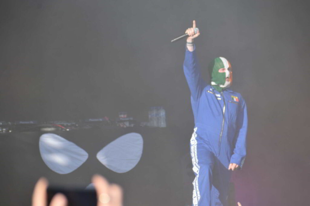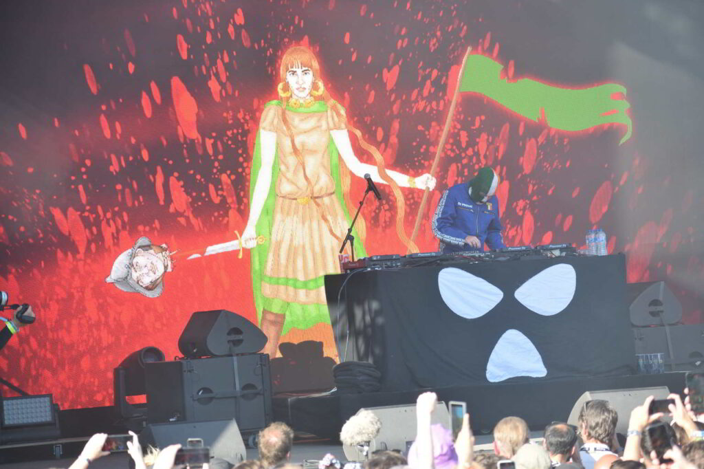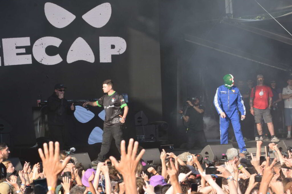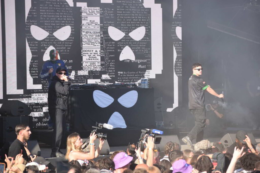 Un espace visiblement sous-dimensionné pour accueillir le groupe au cœur de toutes les polémiques du fait de la dégradation de la situation en Palestine. Mais Kneecap n’a pas attendu la guerre entre Israël et la Palestine pour faire parler de lui avec son hip-hop masqué. De fait, depuis son album « Fine Art » en 2024, produit par Toddla T, Kneecap s’impose comme une force révolutionnaire. Le groupe désormais grand public tourne aussi au cinéma, notamment avec Michael Fassbender.