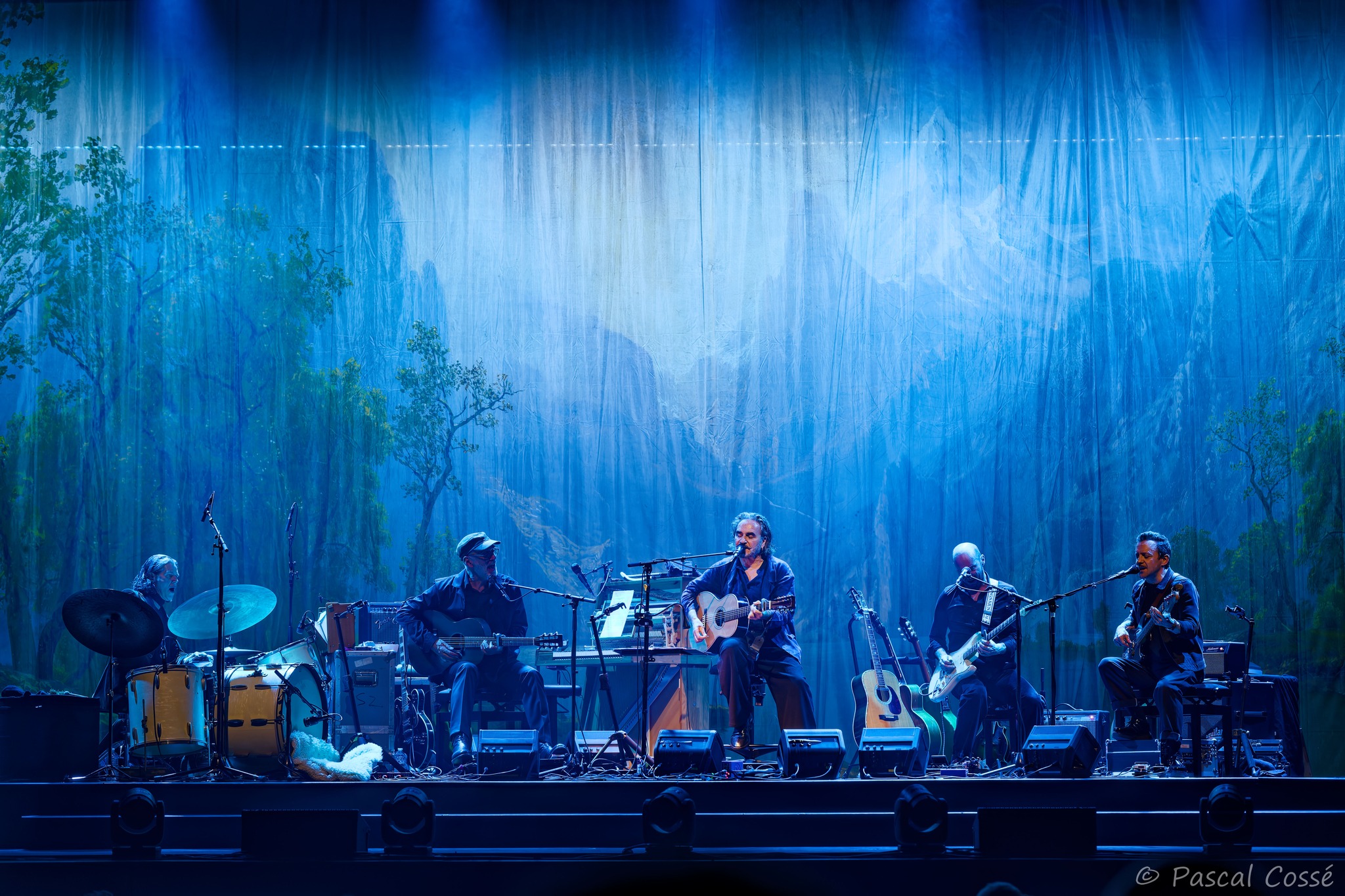 Après une première partie minimaliste avec Zoë Më, qui a représenté la Suisse à l’Eurovision, accompagnée d’une violoncelliste, le rideau se lève sur un tableau du lac Léman et ses montagnes et cinq chaises alignées, avec la batterie sur la gauche de la scène.