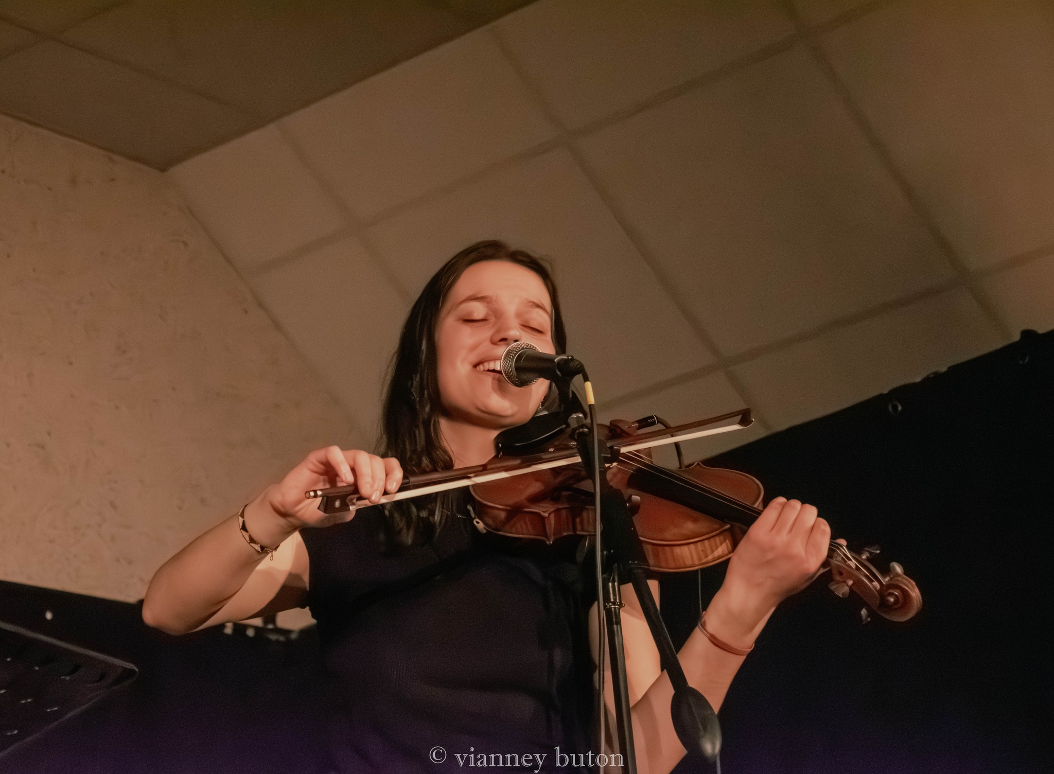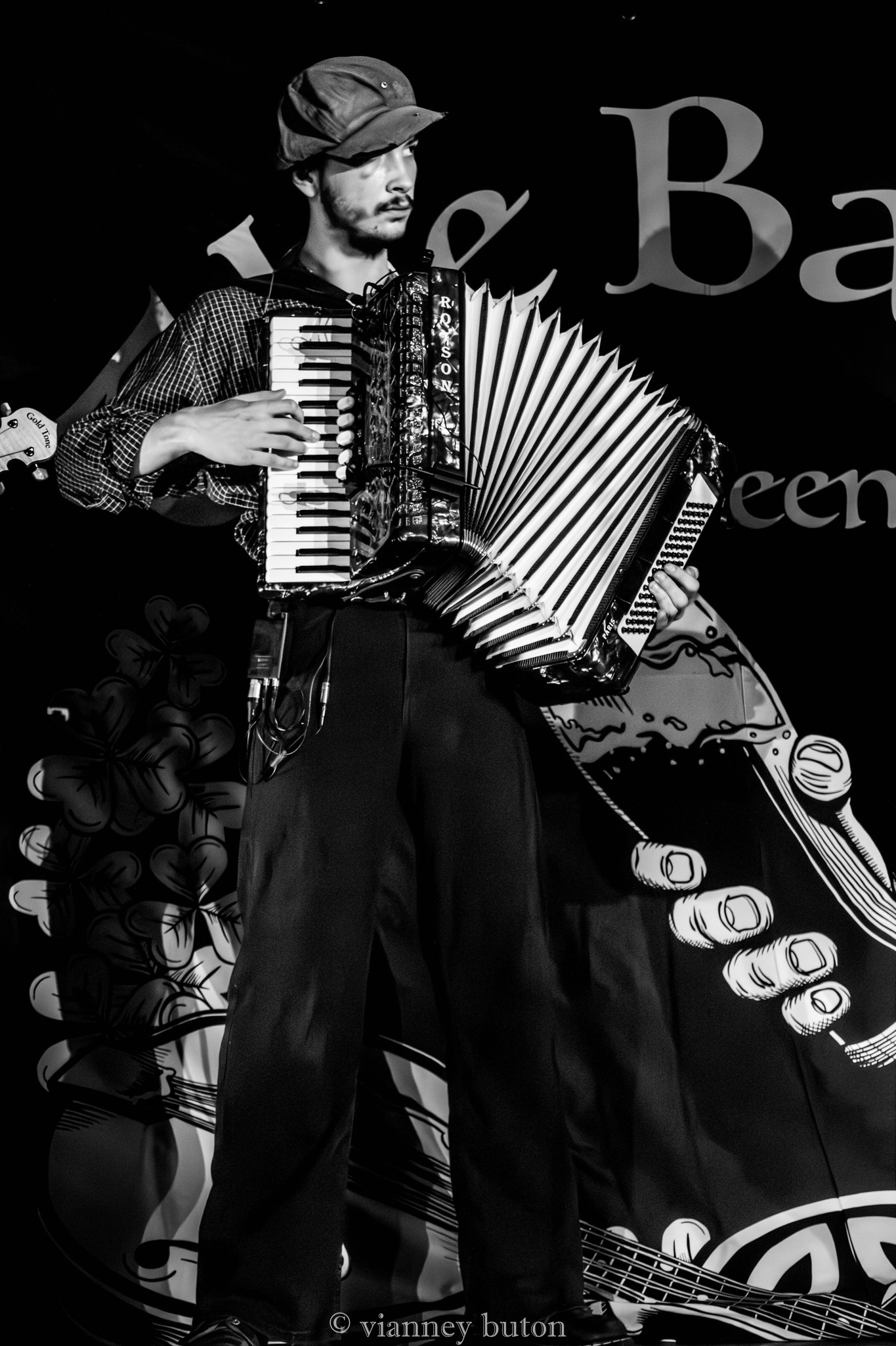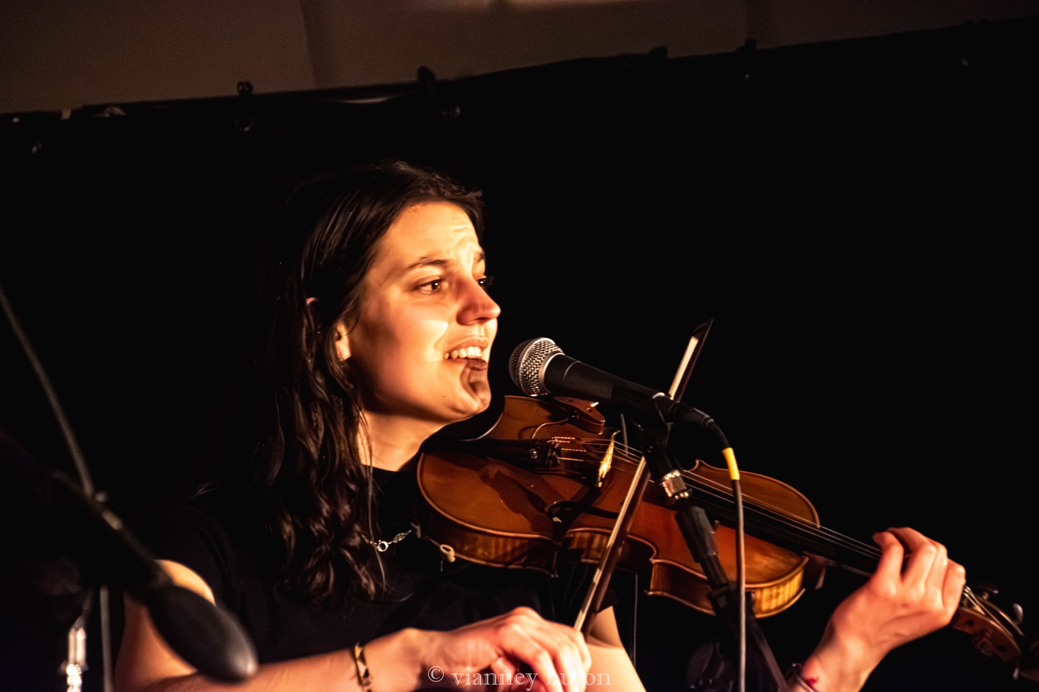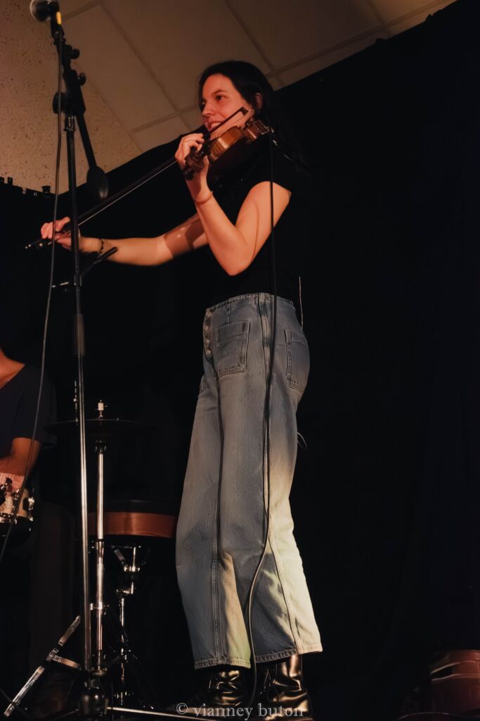 Dès les premiers morceaux, la complicité entre les musiciens est évidente. Le violon de Fanny apporte une touche tantôt mélancolique, tantôt virevoltante, parfaitement soutenue par le banjo de Florian et l’accordéon de Bambino, qui donnent toute sa couleur traditionnelle au répertoire. La rythmique, assurée avec finesse par Antoine, porte l’ensemble avec énergie sans jamais écraser les mélodies, tandis que la voix d’Achille, sincère et habitée, guide le public au fil des histoires chantées.