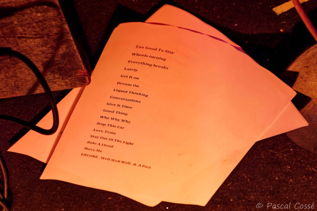 La setlist prévue avec 16 titres + 2 rappels a été écourtée à la demande de l’organisation pour respecter le couvre-feu de 23h00. Donc, seulement 15 titres, au grand dam du groupe et du public privé de Move Me, un de leur morceau phare de 85, et des rappels. Pas cool !